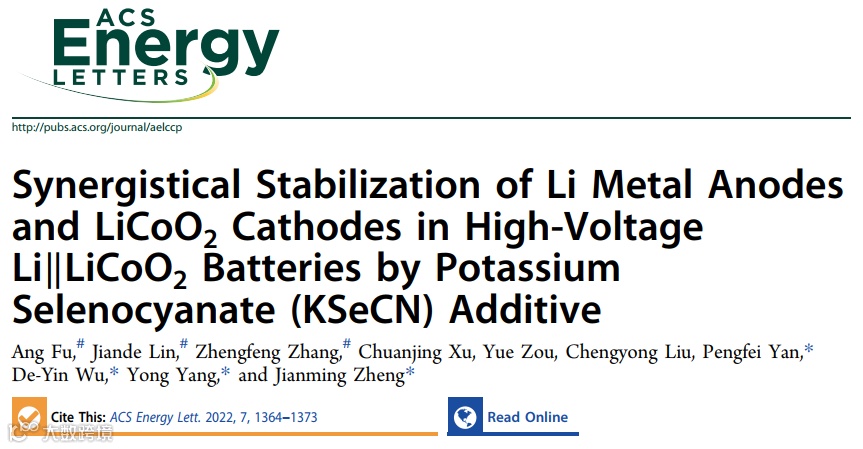 基于此,来自厦门大学的郑建明教授课题组,联合厦门大学杨勇教授、吴德印教授和北京工业大学闫鹏飞教授,在国际顶尖期刊ACS Energy Letters上发表题为“Synergistical Stabilization of Li Metal Anodes and LiCoO2 Cathodes in High-Voltage Li||LiCoO2 Batteries by Potassium Selenocyanate (KSeCN) Additive”的文章。