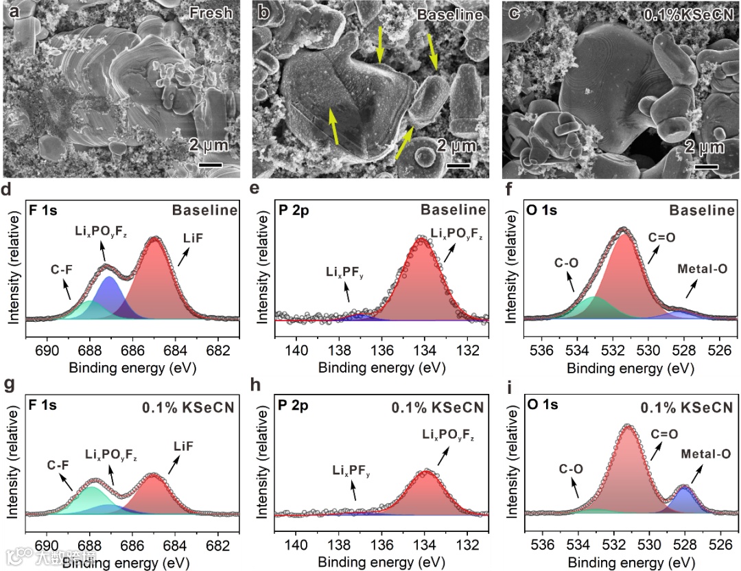 此外,如图7所示,LCO正极在基准电解液中循环200次后,LCO颗粒表面粗糙,这是由于高电压下电解液与电极表面相互作用累积较厚的副产物层。在优化的电解液中循环后的LCO正极颗粒表面光滑,没有明显的副产物堆积现象,证实了KSeCN在正极侧预分解,并参与形成了稳定且致密的CEI膜。从XPS测试结果中可知,在电解液中添加KSeCN后,正极表面F和P元素的百分比明显降低,表明锂盐LiPF6的消耗得到了明显抑制。