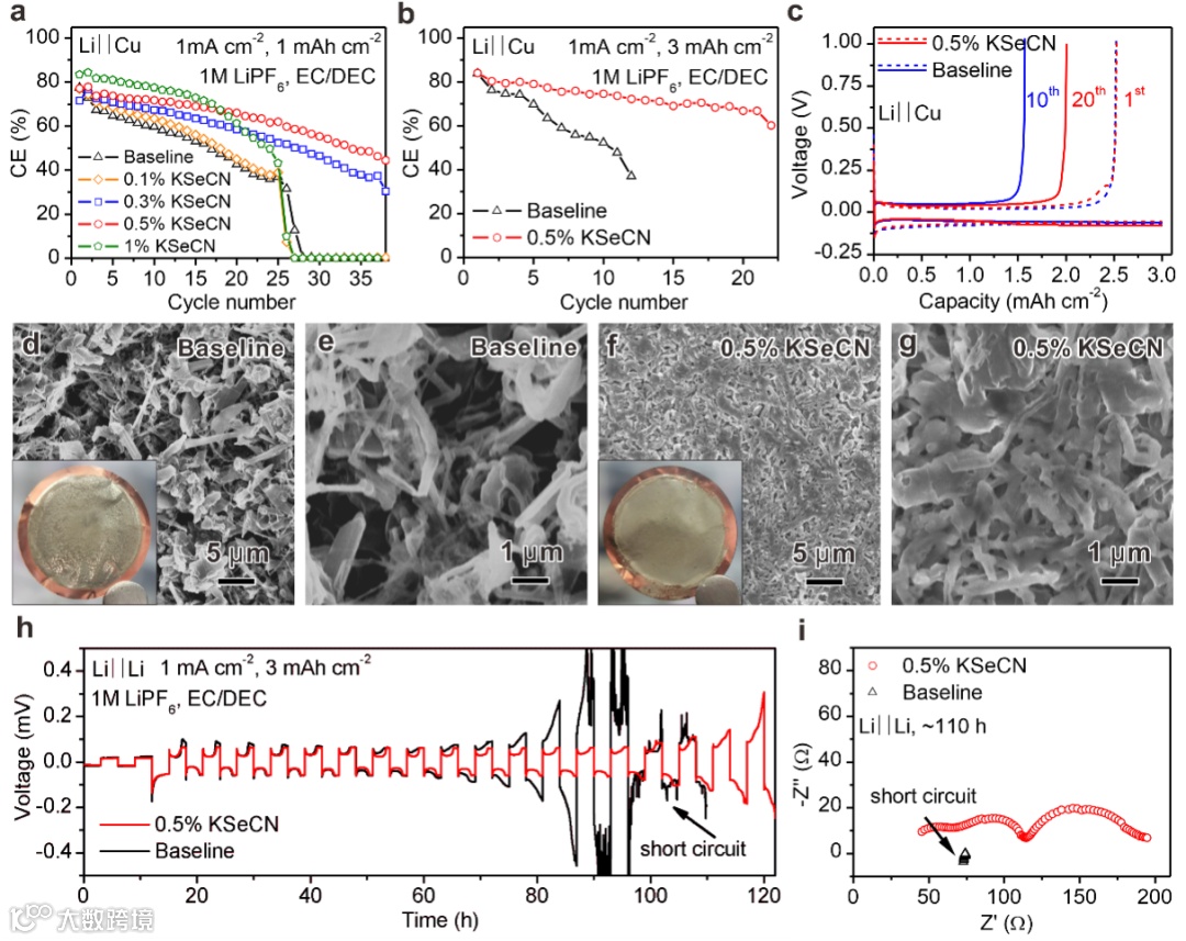 图2.(a)在传统酯类电解液(1M LiPF6,EC/DEC)中,KSeCN的添加量对锂沉积/剥离库伦效率的影响(Li||Cu电池,电流密度为1mA cm-2,沉积容量为1mAh cm-2;(b,c)在电流密度为1mA cm-2,沉积容量为3mAh cm-2的测试条件下,Li||Cu电池在酯类电解液(含/不含0.5 wt% KSeCN)中的(b)锂沉积/剥离库伦效率(c)及对应的容量-电压曲线;(d-g)Li||Cu电池在(d,e)传统酯类电解液和(f,g)含有0.5 wt% KSeCN的酯类电解液中循环10圈后,再沉积1mAh cm-2锂金属的SEM图和光学照片;(h,i)Li||Li对称电池在含/不含0.5 wt% KSeCN的酯类电解质中的(h)循环性能和(i)循环110 h后的阻抗图。
