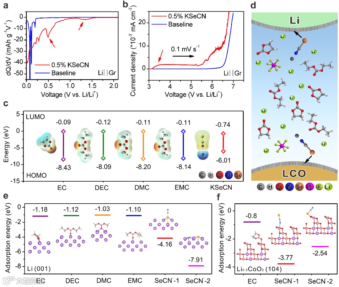 图1.(a)Gr电极在传统酯类电解液(1M LiPF6,EC/DEC)和含有0.5 wt% KSeCN的电解液中锂化的dQ/dV曲线;(b)Gr电极在上述两种电解液中正扫的线性扫描伏安图(LSV);(c)常规酯类溶剂和KSeCN的LUMO和HOMO计算结果;(d)KSeCN协同稳定锂金属负极和LCO正极界面的示意图;(e,f)常规酯类溶剂和SeCN-在(e)Li(001)晶面和(f)Li0.5CoO2(104)晶面的吸附能对比。