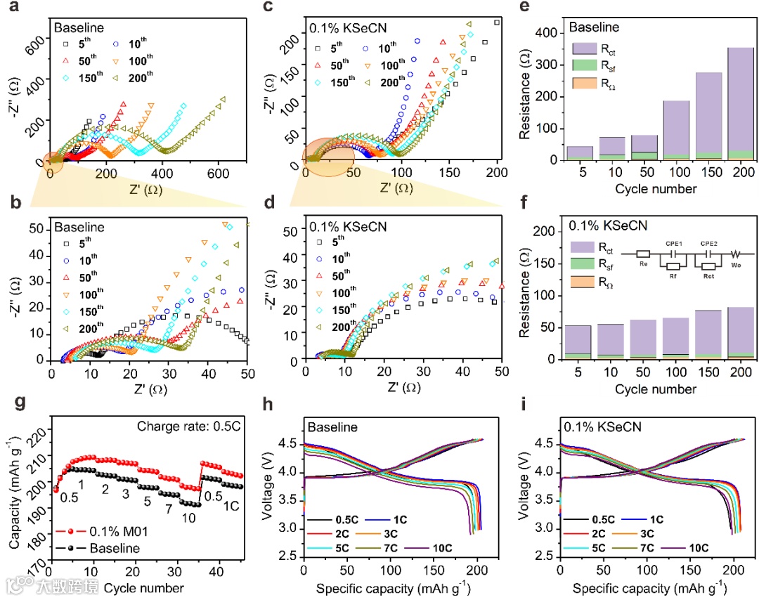 为了进一步揭示KSeCN添加剂对Li||LCO电池循环性能提升的电化学机理,文中研究了电池在1C倍率下循环不同圈数的阻抗谱,并对测试结果进行拟合(如图5所示)。可以发现,在优化的电解液(含有0.1 wt% KSeCN)中循环的电池的Rsf和Rct在全生命周期内较低,这归因于0.1 wt%KSeCN可以参与形成保护性界面层,有效抑制副反应产物的积累,维持锂离子在界面上的快速传输。因此,Li||LCO电池在优化的电解液中也具有更优异的倍率性能。
