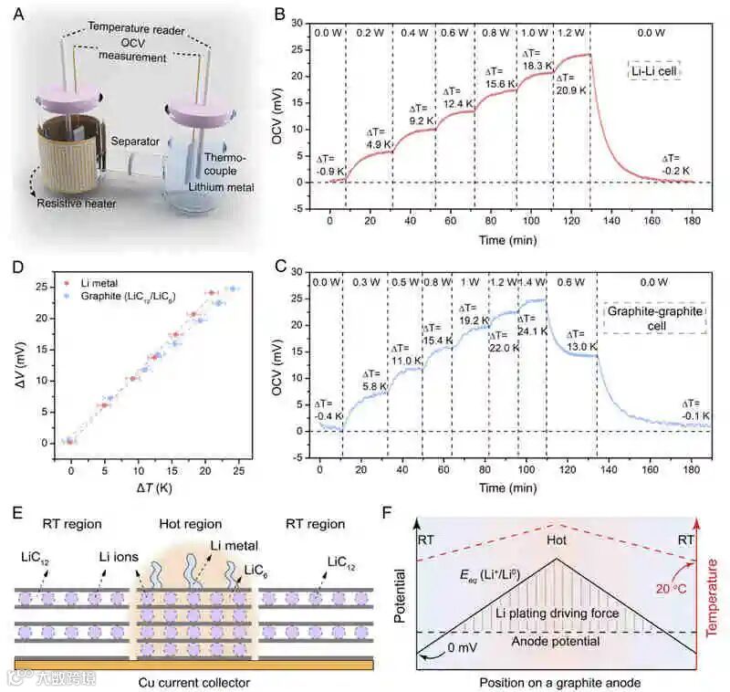 对于半反应A+ne-→B,其平衡电极电势对温度的依赖性由温度系数(α)来描述。为了准确地测量它们的温度系数,作者设计了一个非等温H电池,在两个腔室中都使用锂箔(如图A所示)或石墨作为电极。将热电偶插入每个室中,其探头紧邻电极/电解质界面。电解质是在碳酸亚乙酯(EC)/碳酸二亚乙酯(DEC)中的1 M六氟磷酸锂。在实验过程中,一个腔室以可调的功率加热,而另一个腔室不加热,以便在两个电极之间产生温差。在整个测量过程中记录开路电压(OCV)。图B和C显示了金属锂和石墨在不同温度差(ΔT)下OCV的演变。最初,两个腔室均处于室温(ΔT〜0 K),因此OCV也是〜0 V。随着作者逐渐增加加热功率,ΔT和OCV逐渐增加,并在约20分钟内达到一系列稳态(图B和C)。实验结束后关闭加热器,并且ΔT和OCV均下降至几乎为零,从而确认电极未因测量中的加热而损坏。由于在整个实验过程中电池始终处于开路状态,因此每个稳态下的OCV都表示由ΔT引起的平衡电势差(ΔV)。通过线性拟合稳态ΔT和ΔV数据(图D)获得每个氧化还原反应的温度系数。
