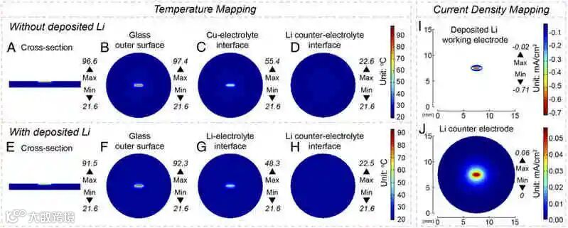 为了定量地了解实验观察结果,作者在COMSOL Multiphysics中执行了热模拟。在锂沉积开始之前,作者首先对锂铜电池进行建模。图A示出了整个电池的横截面温度分布。温度升高主要集中在加热器附近的玻璃盖玻片内部。图B示出了加热器所在的玻璃的前侧的温度。中心的最高温度为97.4 °C,与实验结果相似。温度迅速降低至室温。图D示出锂对电极的整个表面上的温度低于22.6 ℃。最重要的是,铜/电解质界面(图C)显示最高温度仅为55.4 °C。此外,实验结果表明,在阶段III中,加热器温度从〜95 °C逐渐降低至〜93 °C。为了验证这是由金属锂的沉积引起的,在模型中添加了椭圆形的金属锂。图E显示加热器温度降低至〜92.3 ℃,与实验观察一致。这是因为所沉积的锂相对于电解质的高热导率促进了散热。在图G中,沉积的锂表面处的温度也下降至48.3 ℃。