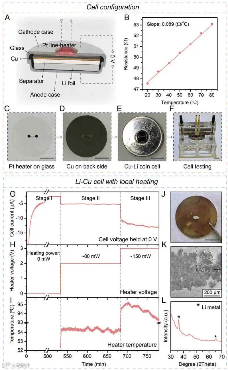 作者首先证明,使用Li–Cu电池,金属锂镀层可在0 V下发生。图A显示了纽扣电池的配置。工作电极由圆形玻璃盖玻片作为基材,正面的铂(Pt)线加热器(图C)和背面的铜集流体(图D)组成。锂金属盘配对作为对电极和参比电极(图E)。在正极壳上会形成一个窗口,以暴露Pt加热器以连接到外部电源(图F)。Pt加热器的电阻随温度线性变化(图B)。在测量期间,铜电极的电势升至0V。最初不提供加热(图H中的阶段I)。电池的负电流(图G中的阶段I)归因于双层充电和SEI在铜表面的形成,然后随着铜表面的钝化而衰减。电流在约500分钟内达到稳定状态。在这种情况下,锂不沉积。然后(阶段II),通过施加约80 mW的加热功率将加热器加热到55 °C(图I)。观察到电池电流的瞬时增加(图G)。随后(阶段III),加热器温度进一步以150 mW的功率升至95 °C(图I),电池电流的大小进一步增加至超过10 μA(图G)。即使加热器温度很高,作者预计玻璃热障下方的铜上的最高温度在40至60 °C之间。图J展示出了实验后的铜集流体的照片。银色材料出现在盖玻片背面Pt加热器的位置。扫描电子显微镜(SEM)(图K)和X射线衍射(XRD)(图L)表明,这种银色材料是树枝状金属锂。这证实了在温度为0 V的情况下,金属锂沉积在铜上的情况是由温度不均匀引起的。