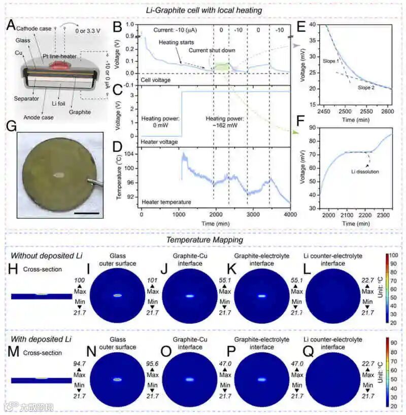 基于Li-Cu电池的实验装置,作者证明在锂-石墨电池中,金属锂镀层可在0 V以上发生。电池的结构(图A)与Li-Cu电池的结构相似,不同之处在于,在铜集流体上涂覆了一层石墨。为了最大程度地降低动力学影响,在不进行局部加热的情况下,向锂-石墨电池施加了–10 μA的恒定电流。观察到三个不同的电压平稳期,分别对应于石墨的不同嵌入阶段(图B)。该电压平稳期对应于金属锂溶解和嵌入到未完全嵌入的石墨颗粒中。消耗掉可逆金属锂之后,电池电压再次增加到〜85 mV(图F)。此后,-10 μA的电流反复导通和截止,并且观察到相似的电压曲线(图B)。加热器温度也被记录下来(图D)。开始加热后,加热器温度首先稳定在约103 °C,然后随着充电过程而降低,并在电池静止时缓慢升高。测量之后,将硬币电池拆开,石墨电极如图G所示。这证实了不均匀的温度分布会导致金属锂在高于0 V的石墨负极上沉积。