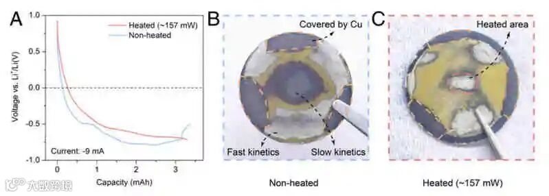 锂石墨电池在∼C/15下,经过一次形成循环后,石墨负极在2 C的高倍率下充电。一个电池在整个充电过程中不加热,另一个电池由功率为∼157mW的铂加热器局部加热。电池电压如图A所示。在施加电流后不久,两个电池的电压都降到0 V以下。在未加热的电池充电结束时,电池电压的小上升可能是由于树枝状锂的形成而引起的,这可能导致过电位的波动。加热的电池电压始终高于未加热的电池电压,这是由于更快的动力学以及石墨的平衡电势上移所致。充电容量达到3.3 mAh后立即拆卸电池,石墨电极的表面形貌如图B和图C所示。未加热的电池有三个黑色区域(图B中有橙色虚线的方框),表明这些区域中的石墨没有插入。这是因为这些区域被铜箔覆盖。在电极的外围观察到三个明显的金属锂镀层区域。作者将其归因于与铜箔相邻的这些区域的电子电阻降低