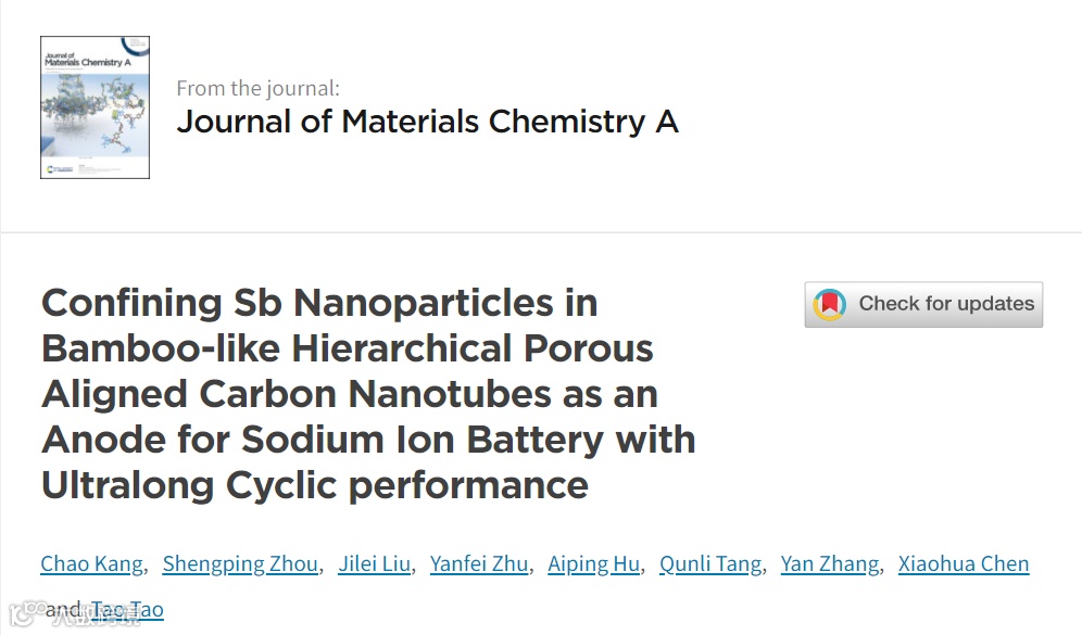 近日,湖南大学陈小华教授、胡爱平教授“Confining Sb Nanoparticles in Bamboo-like Hierarchical Porous Aligned Carbon Nanotubes as an Anode for Sodium Ion Battery with Ultralong Cyclic Performance"为题,在Journal of Materials Chemistry A 上发表最新研究成果。