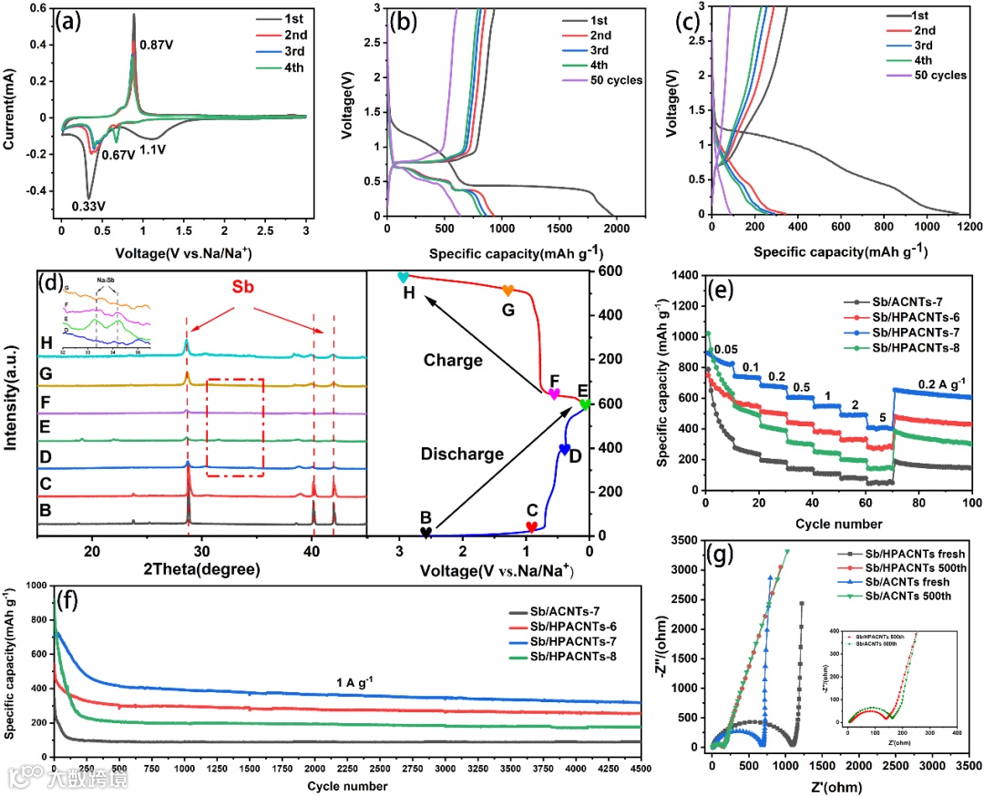 图 3 Sb/HPACNTs电化学性能的表征及反应机理的分析