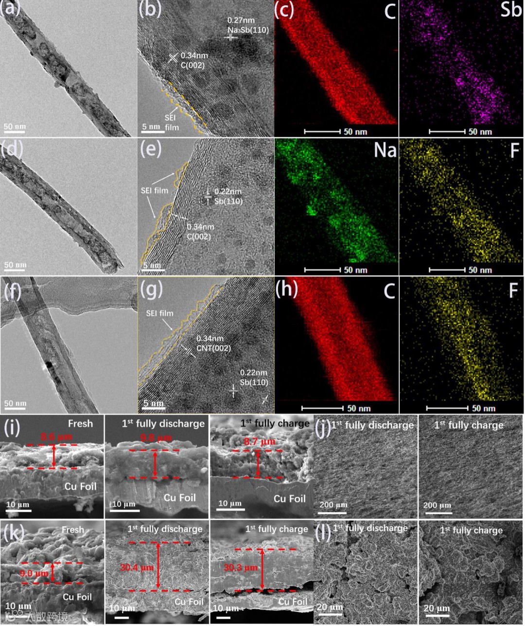 图 4 Sb/HPACNTs循环前后的非原位TEM及SEM表征