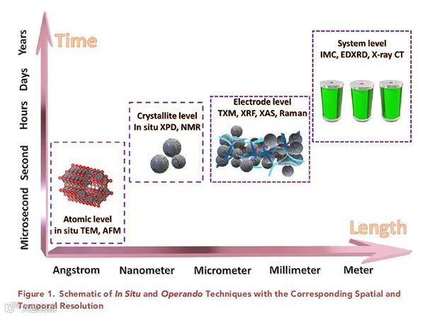 为了解决锂离子电池在表征过程中对研究对象的破坏性,在不同尺度和时间范围内对电池进行全面表征至关重要。因此,针对不同尺度的新兴的原位表征方法成为解决当前挑战的有效方法也是未来重要的研究方向。作者提供了一系列原位表征的示例,主要集中在原子,微晶/粒子,电极和电池系统尺度上,并着重于两种电极材料:嵌入和转化型。作者对每种技术的工作原理,功能,分析方法以及从每种表征能够获得的信息进行了讨论。作者提出了电化学储能材料和系统的原位表征的必要性和重要挑战。此外,他们建议未来的方向应该以解决目前遇到的问题为主,以及有关锂离子电池应用和新兴的设计概念等。
