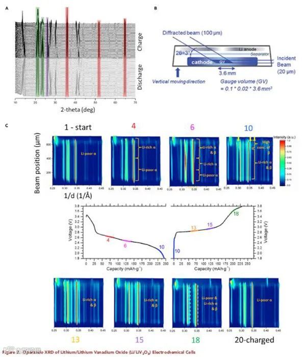 图2. 锂/锂钒氧化物(Li/LiV3O8)电化学电池的原位XRD。(A–C)(A)时间分辨角色散XRD,(B)能量色散XRD示意图,以及(C)电池电压曲线和轮廓图。