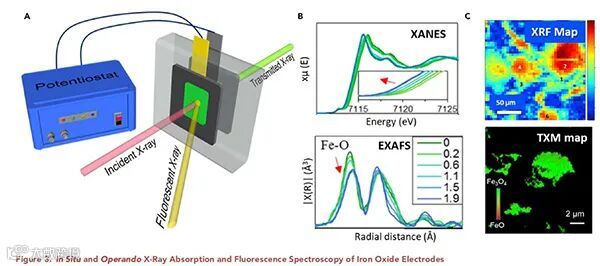 图3. 氧化铁电极的原位X射线吸收和荧光光谱。(A–C)(A)实验几何形状,(B)时间分辨的测量值-(顶部)XANES,(底部)扩展的X射线吸收精细结构数据,(C)空间分辨的测量值-(顶部)XRF和(底部)TXM映射。