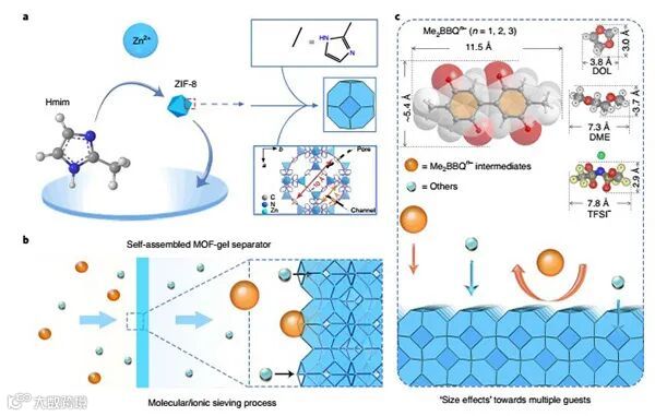 图1. 二次有机电池中MOF凝胶隔膜的示意图。a,微孔MOF凝胶隔膜(ZIF-8)自组装示意图。b,MOF凝胶隔膜分子和离子筛分过程示意图。c,利用DFT计算优化Me2BBQn−(n=1,2,3)氧化还原中间体的几何构型。
