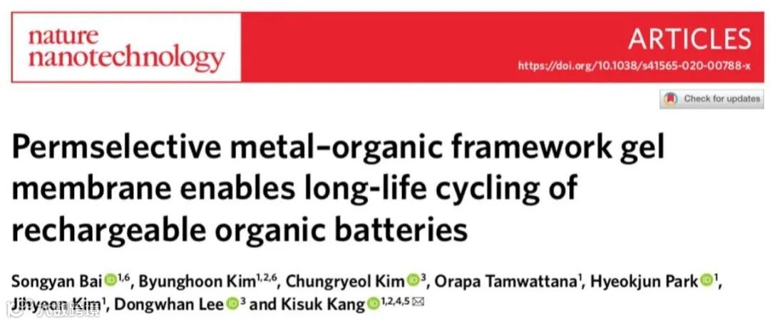 Permselective metal–organic framework gel membrane enables long-life cycling of rechargeable organic batteries.(Nat. Nanotechnol., 2020,DOI: 10.1038/s41565-020-00788-x)