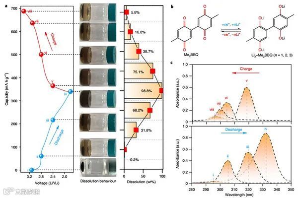 图2. Li‒Me2BBQ电池溶解行为的示意图。a,使用Celgard隔膜时Li‒Me2BBQ电池的放电电荷分布图。b,提出的电池氧化还原机理。c,不同氧化还原状态下Me2BBQn-氧化还原中间体的紫外-可见光谱。
