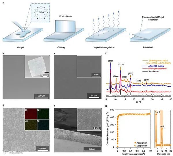 图3. MOF-凝胶隔膜的制备与表征。a,示意图显示了MOF-凝胶隔膜的制造过程,它结合了刮刀铸造和汽化-凝胶化过程。b、c,表面平整光滑的MOF-凝胶隔膜的扫描电镜图像和放大的扫描电镜图像。d,MOF-凝胶隔膜的放大扫描电镜图像。e,MOF-凝胶隔膜的扫描电镜图像。f,MOF-凝胶隔膜的粉末X射线衍射图,g,STP条件下MOF-凝胶隔膜的N2吸附光谱和孔径分布。