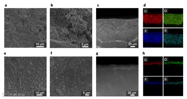 图5. 循环后锂金属电极的表面形貌。a,b,常规隔膜循环后锂金属电极进的SEM图。c、d,使用常规隔膜的锂金属电极截面SEM图和EDS图。e,f,MOF凝胶-隔膜电池100次循环后,锂金属电极的SEM图。g,使用MOF-凝胶隔膜的锂金属电极的扫描电镜图像。h,MOF-凝胶隔膜电池循环后锂金属电极的EDS元素图。