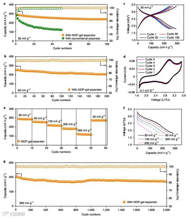 图4. Li‒Me2BBQ电池的电化学性能。a,MOF-凝胶隔膜和传统Celgard隔膜时的循环曲线。b,MOF-凝胶隔膜循环曲线。c,MOF-凝胶隔膜时电池的充放电曲线。d,MOF-凝胶隔膜时Li‒Me2BBQ电池的循环伏安曲线。e,MOF-凝胶隔膜Li‒Me2BBQ电池的放电容量。f,在电流密度为30~600 mA g−1时,放电电压分布。g,在电流密度为300 mA g−1时的循环曲线。