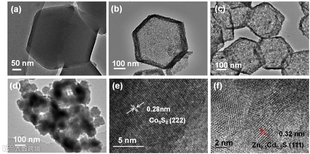 Figure 1. TEM images of (a) ZIF-67 (b) CoSx (c) Co9S8 (d) 10Co9S8/ZCS; (e-f) HRTEM in sample of 10Co9S8/ZCS composite.