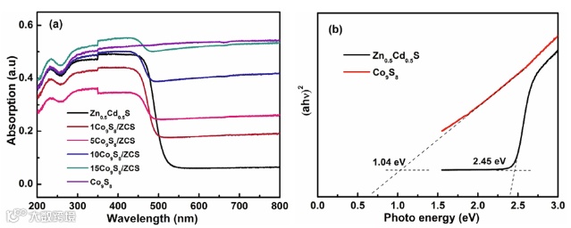 Figure 2. (a) UV-Vis DRS spectra of Co9S8, Zn0.5Cd0.5S, xCo9S8/ZCS (b) Band gap energies of Co9S8 and Zn0.5Cd0.5S.