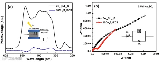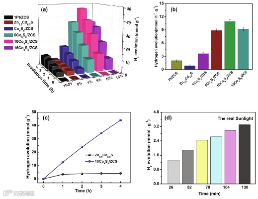 文章通过低温油浴的方法将Zn0.5Cd0.5S原位生长在中空多面体Co9S8纳米材料上,有效提高了光吸收,并在一定程度上缓解了Zn0.5Cd0.5S光腐蚀现象,抑制了光生载流子的复合,显著提高了Zn0.5Cd0.5S的光催化制氢性能。