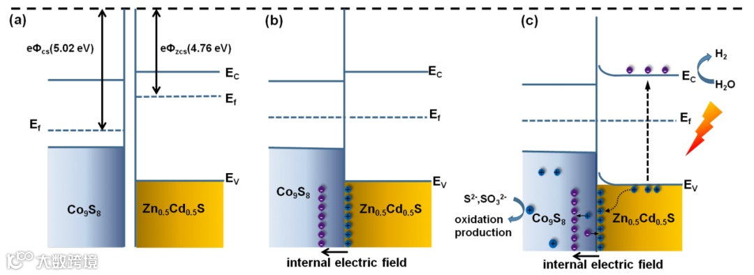 Scheme. 2. Schematic illustration of (a) the band structure alignments of Co9S8and Zn0.5Cd0.5S; (b) the formation of interfacial electric field between Co9S8 and Zn0.5Cd0.5S; (c) the charge transfer in Co9S8 /ZCS hybride under visible light irradiation.