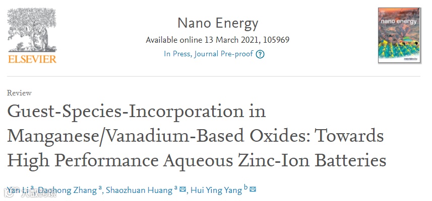 基于此,中南民族大学的黄绍专教授和新加坡科技设计大学的杨会颖教授,在国际知名期刊Nano Energy 上发表题为“Guest-Species-Incorporation in Manganese/Vanadium-Based Oxides: Towards High Performance Aqueous Zinc-Ion Batteries”的综述文章。