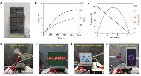因此,接近室温的LTCs达到了11.1%的相对卡诺循环效率,所进行的设备演示(驱动电扇、LED阵列、电子温度湿度计,甚至还可以为手机充电)为低成本的热量收集提供了承诺。这些例子表明,LTCs可能是收集低品位废热的可行技术。本文的方法可以扩展到其他利用相应氧化还原物质的热敏晶体的LTC系统,以及其他热能收集系统,包括热再生电化学循环和直接热充电电池。