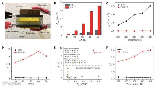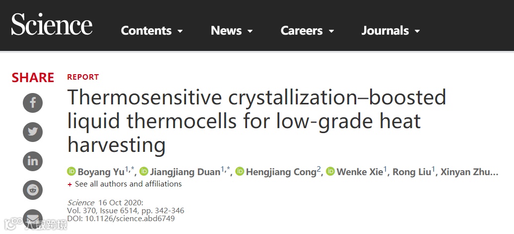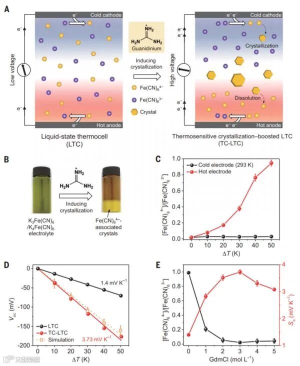 华中科技大学武汉光电国家研究中心周军教授团队在Science发文Thermosensitive-crystallization boosted liquid thermocells for low-grade heat harvesting来解决效率低的问题。