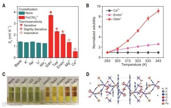 作者使用热敏结晶和溶解过程来诱导一个持久的浓度梯度氧化还原离子,获得了高度增强的塞贝克系数(~3.73毫伏每开尔文),并抑制在LTCs中热导率。具体说来,是利用利用胍离子与亚铁氰根离子结合形成的热敏性晶体材料-亚铁氰钾胍水合物(K2(C(NH2)3)2Fe(CN)6·6H2O)具有良好的溶解度热敏性,来形成热敏结晶增强液态热电电池 (TC-LTC)。该材料的引入,使得50摄氏度的正负极温差可在电池两端形成47倍的离子浓差,该浓差电池将塞贝克系数从基准体系的1.4 mV K-1提升至3.73 mV K-1,此外,由于器件热端还存在大量未溶解的晶体沉淀物,从而可极大地抑制溶液对流,大幅降低有效热导率。