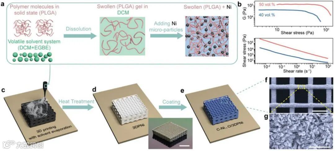 图1。镍基墨水及流变性质、3D打印实现催化剂有序孔结构示意图,以及电极形貌结构。
