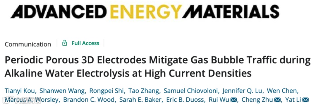 近日,加州大学圣克鲁兹分校Yat Li教授课题组联合劳伦斯利弗莫尔国家实验室朱诚博士和上海交通大学吴睿教授,在国际知名期刊Advanced Energy Materials刊发了题为“Periodic Porous 3D Electrodes Mitigate Gas Bubble Traffic during Alkaline Water Electrolysis at High Current Densities”的研究文章。