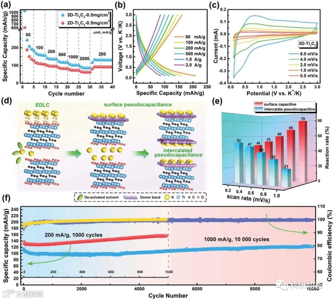 如图3a所示,由于3D-MXene比2D-MXene具有更高的表面积,因此获得了更高的比容量。在反应过程中,K离子的储存机制可以分为三种:首先为表面双电层的形成;随后随着双电层电位差的加大,K离子开始在表面发生氧化还原反应;最后随着反应时间和电势的进一步加大,K离子会插入到MXene层间,并发生氧化还原反应。图3c展现了3D-MXene的CV曲线,位于0.6/0.5 V处的氧化还原峰可以归为K离子在MXene层间的反应,也称为插层赝电容。通过对不同扫速下的CV曲线进行分析,可以得到不同扫速下插层反应和表面反应过程的比例,正如图3e所示,3D-MXene由于其更大的暴露面积而展现了更多的表面过程。图3f展现了3D-MXene的循环性能,1.0 A/g下经过10 000圈后,电极仍能保持116%比容量,这种逐渐上涨的现象可以归结为在反应过程中MXene层间距不断扩张的现象。