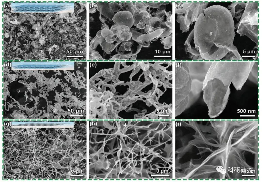 Figure 2. 3D morphologies of different 2D materials. a–c) Macroporous sphere/tube Ti3C2Tx, d–f) microporous tube Ti2CTx, and g–i) nanoscroll GO.