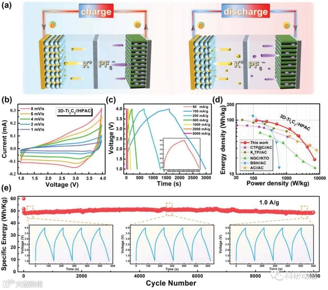 在传统摇椅式K离子电池中,电池会遭受来自阳极和阴极双倍的、缓慢的半扩散限制,从而导致了较差的倍率和循环性能。而手风琴式的K离子混合电容器的提出可以明显改善提升器件的功率和循环性能。由于3D-MXene展现了快速的反应动力学,当其作为K离子混合电容器阳极材料时,混合电容器件展现了较好的倍率性能,和超稳定的循环性能,1 A/g下经过10 000圈循环后,能量保持率仍为100%,为K离子储能器件的开发与设计提供了一个可行的方案。