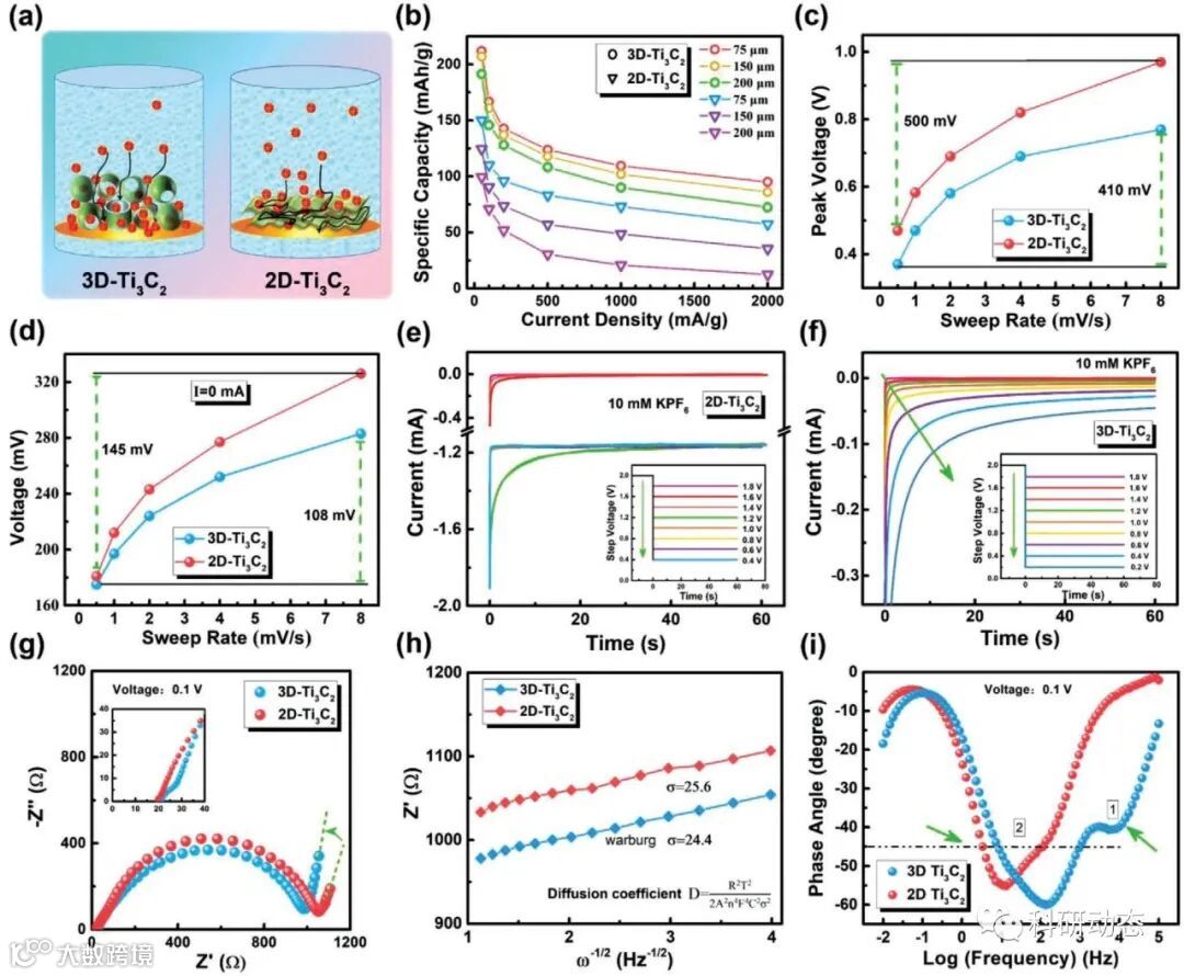 electrode thicknesses. Comparison of c) anodic peak potential and d) charging start potential in CV analysis. Step-potential test for e) 2D-Ti3C2 andf) 3D-Ti3C2 in 10 × 10-3 m KPF6. Electrochemical impedance analysis: g) Nyquist image, h) relation of Z′–ω-1/2 curves and Warburg coefficient (σ)