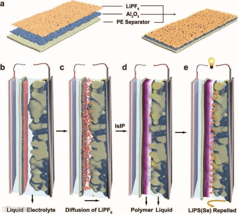 在此,研究者提出了一种原位界面聚合策略,在LiPF6涂层隔膜和正极之间形成液体/聚合物混合电解质。在隔膜上原位形成的聚合物凝胶电解质显示出较高的Li+转移数,可作为防止穿梭效应的化学屏障。通过解决穿梭效应和S/Se不完全放电之间的困境,新的电解质结构被证明可以促进高容量正极的稳定循环。最终实现了高比能、长循环寿命的Li-S和Li-Se电池,具有潜在实用价值。