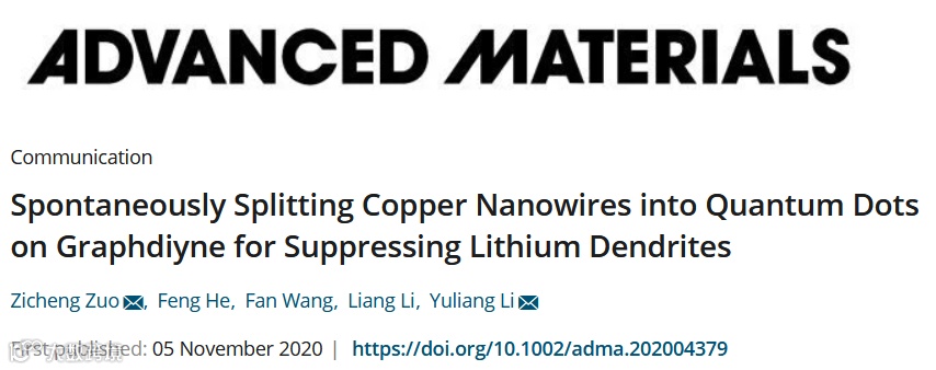 中科院化学研究所AM:自发地将铜纳米线分裂成石墨二炔上的量子点以抑制锂枝晶 科学材料站