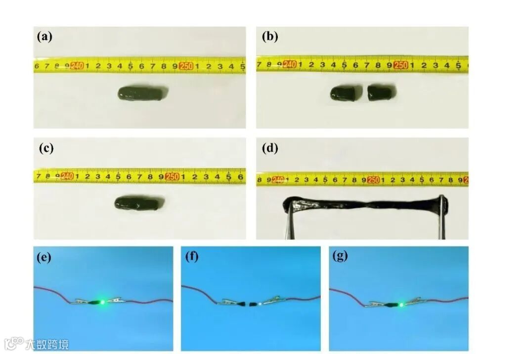 为了进一步验证水凝胶的自愈性能,作者将一系列的LED灯组装在一起。在水凝胶的切割和自愈过程中,熄灭的小灯泡可以与水凝胶重新接触,再次点亮,证明水凝胶可以恢复电性能。