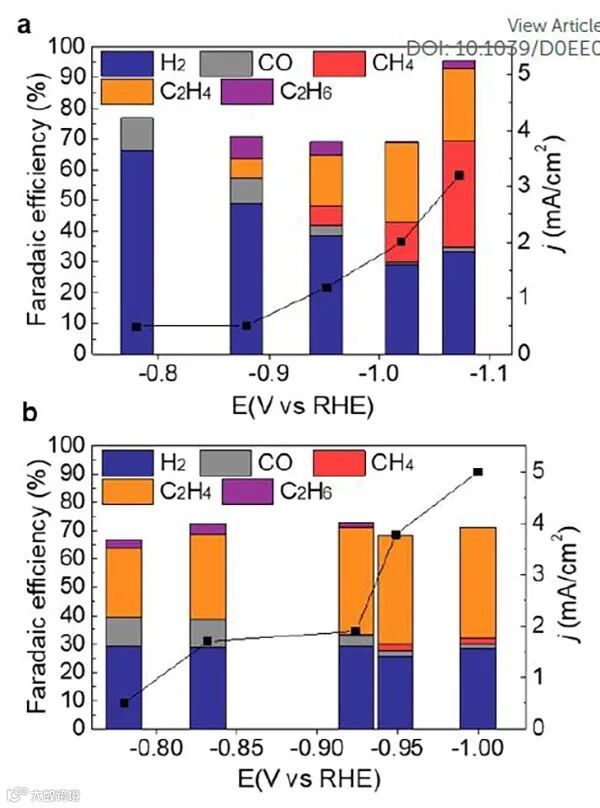 图1比较了电沉积铜(ED-Cu)和喷粉铜(P-Cu)的各种气体产物,最明显的区别是P-Cu的主要产物为C2H4,而ED-Cu显示出相对较高的CH4和H2选择性。特别是在-1.0 V(vs RHE)下,ED-Cu既生成CH4(法拉第效率F.E. =34.6%)又生成C2H4(F.E.=23.7%)。同时,在各个电位下P-Cu主要产生C2H4 (F.E. ≤39%),且抑制了CH4的形成 (F.E. ≤2%)。ED-Cu能够同时发生C1和C2途径,而在P-Cu上C2途径是首选。