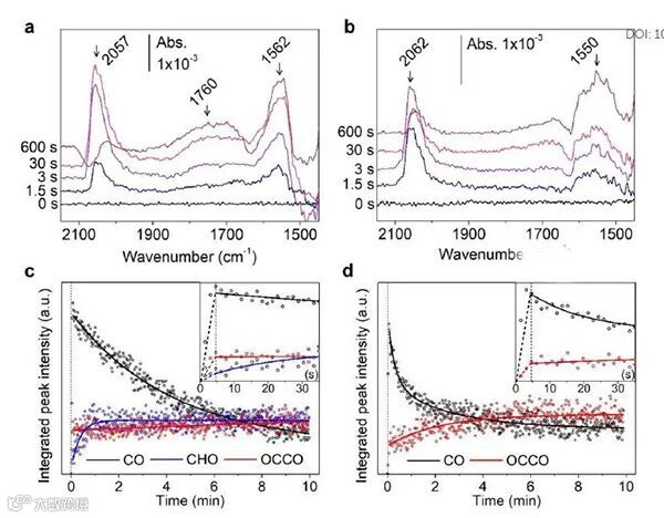 图3. 时间分辨的红外光谱:间隔1.5 s,持续10分钟。光谱在(a)ED-Cu和(b)P-Cu上于-0.94 V的0.1 M KHCO3 D2O电解质中检测,基线光谱为-0.37 V下CO2饱和电解质中。(c)ED-Cu和(d)P-Cu显示了*CO,*CHO和*OCCO的积分峰强度。
