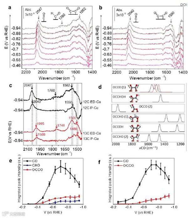 图2. (a)ED-Cu和(b)P-Cu在CO2饱和的0.1 M KHCO3 D2O电解质中-0.37 V下的基线光谱。(c)ED-Cu和P-Cu在-0.94 V下的在13CO2饱和的0.1 M KH13CO3 D2O电解质中13C标记IR光谱(红色)。(e)ED-Cu和(f)P-Cu对于*CO, *CHO, *OCCO在CO2饱和的0.1 M KHCO3 D2O电解质中的积分峰强度,基线光谱在-0.94 V.