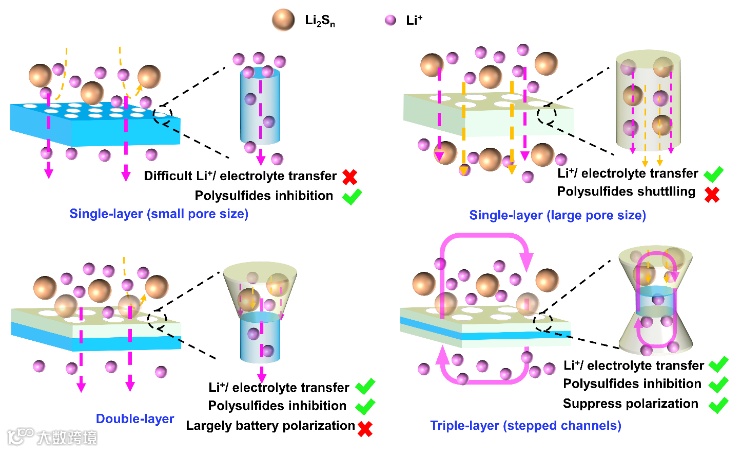 要点三:结合对梯级孔道隔膜的大量表征,揭示了这类三层隔膜材料性能优异的可能机理,为新型Li-S电池高性能隔膜材料的设计提供了参考。