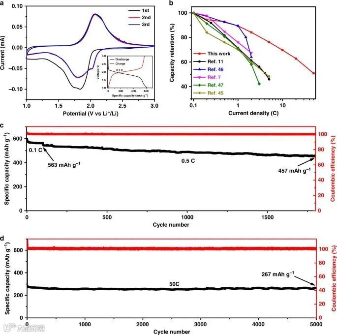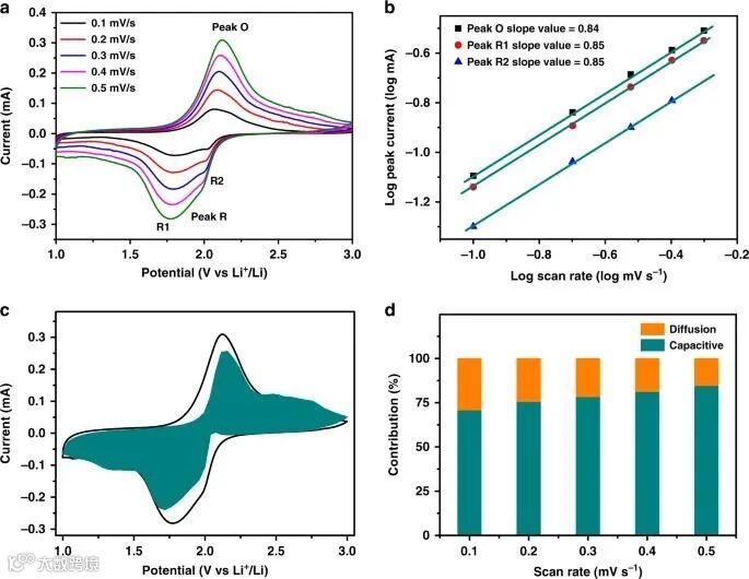 图5c显示,在扫速为0.5 mV/s时,电容过程贡献了总容量的85%。随着扫描速率的增加,电容贡献占总容量的相对比例逐渐增加,如图5d所示。电容贡献与电池电极的反应动力学密切相关。因此,在电池电极中更高的电容贡献将有利于Li的快速传输,从而获得优异的倍率性能与长期循环稳定性。