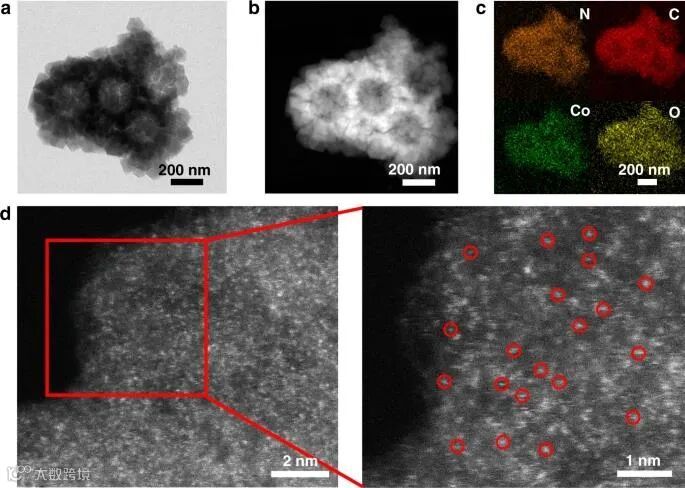 TEM图像(图2a)和HAADF-STEM图像(图2b)证实了所制备的碳材料呈中空结构,且未观察到明显的Co颗粒,EDS图像(图2c)证实了Co、N、O、C在催化剂中均匀分布。从图2d的HAADF-STEM图像中,可以观察到高密度的亮点(用红色圆圈突出显示),显示了原子级分散Co位点的形成。