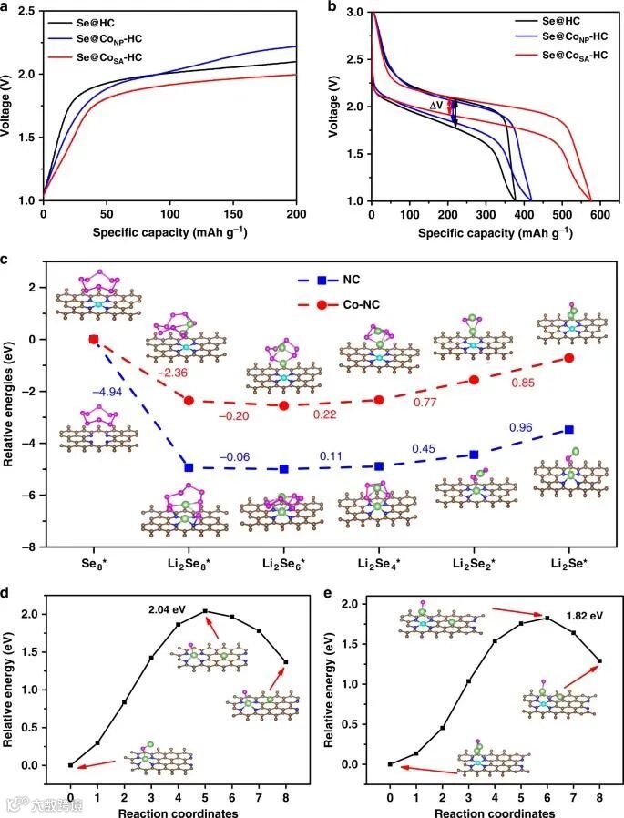 图6 CoSA-HC的催化活性研究:(a)首次充电及(b)首圈放电-充电曲线图;(c)在NC和Co-NC上还原聚硒化物的自由能;在(d)NC和(e)Co-NC上氧化Li2Se的自由能