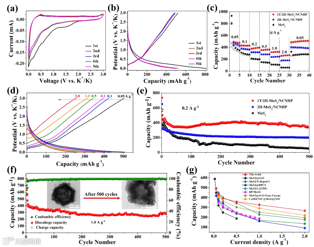 但是,目前很多工作都是某些方面来高MoS2的钾存储性能,缺乏一种合适的设计使MoS2电极兼具良好的导电性、扩展的层间距离、多孔/空心结构和低成本等特点。