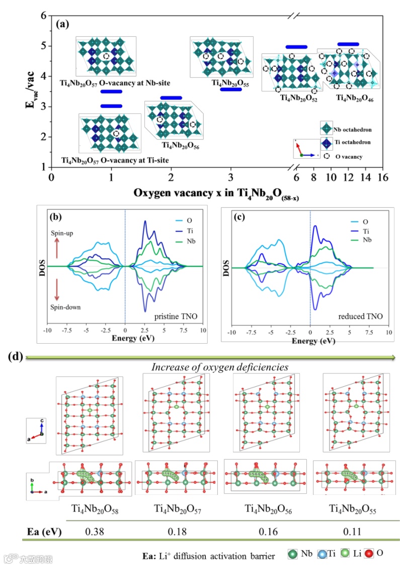 图4. TNO@NC复合电极材料结构中 (a)氧空位的形成能;(b)纯Ti4Nb20O58和 (c)有氧空位的Ti4Nb20O55态密度图;(d)随着结构中缺氧程度的增加,锂离子扩散途径和相应的活化能垒变化趋势。