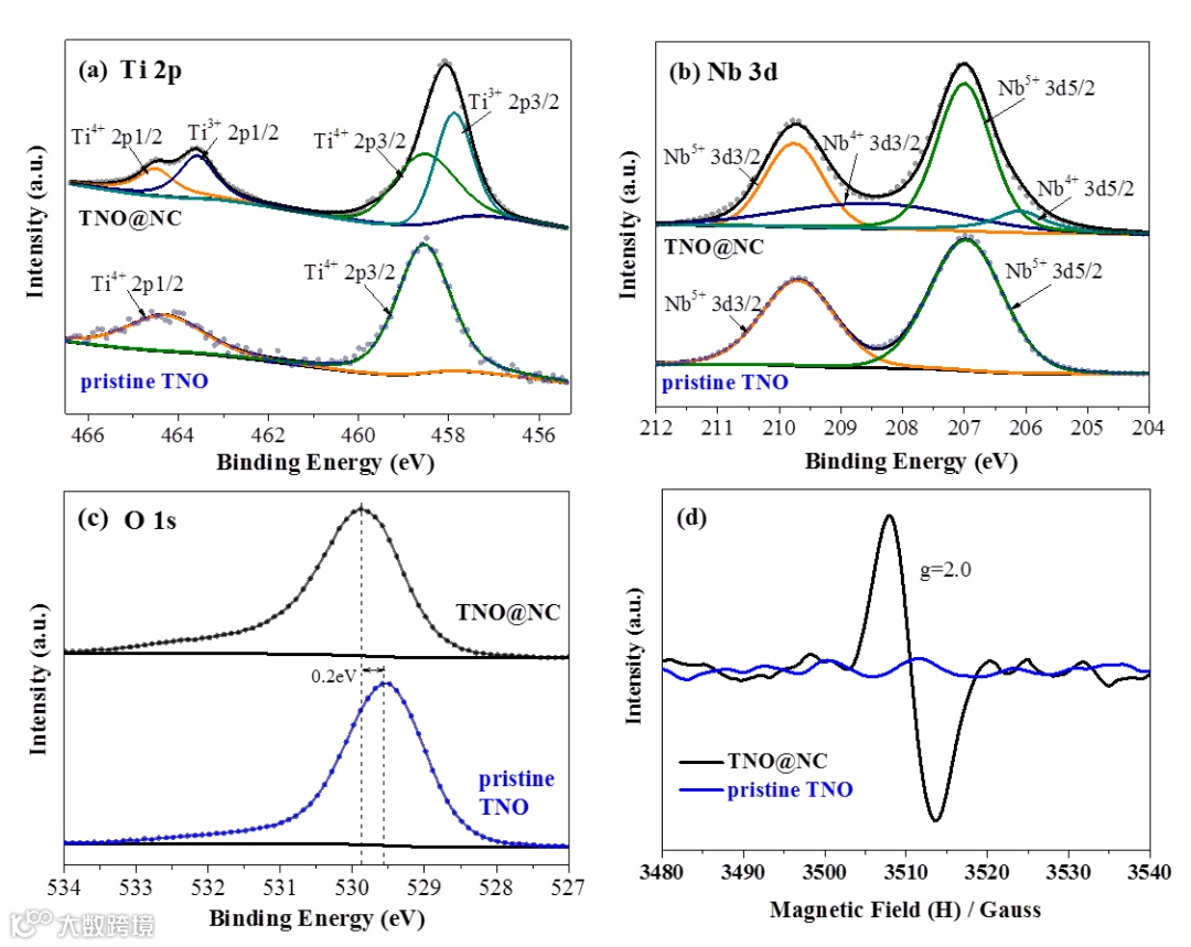 图3. TNO@NC复合电极材料与纯Ti2Nb10O29材料对比的高分辨XPS光谱图:(a)Ti 2p, (b) Nb 3d, (c) O 1s;和 (d) EPR光谱图。