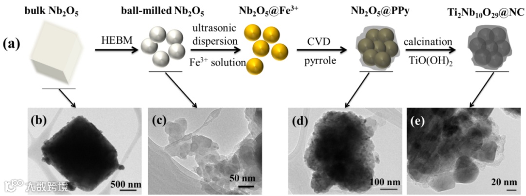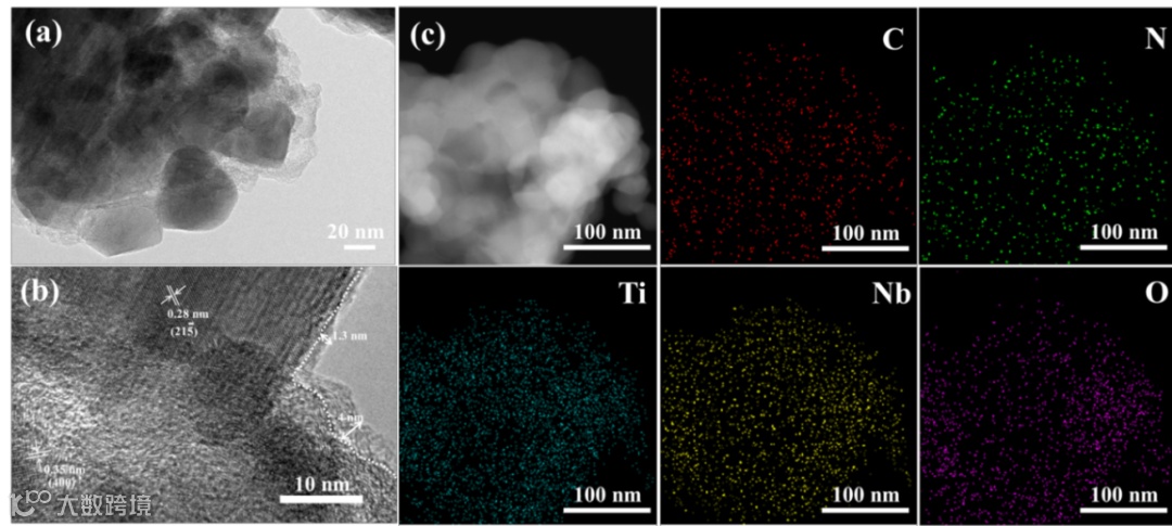 在高温固相合成的过程中,聚吡咯裂解为1-2nm的富氮碳层,不仅为Ti2Nb10O29提供了连续的导电网络,而且作为阻隔层缓解了高温条件下纳米颗粒的烧结。
